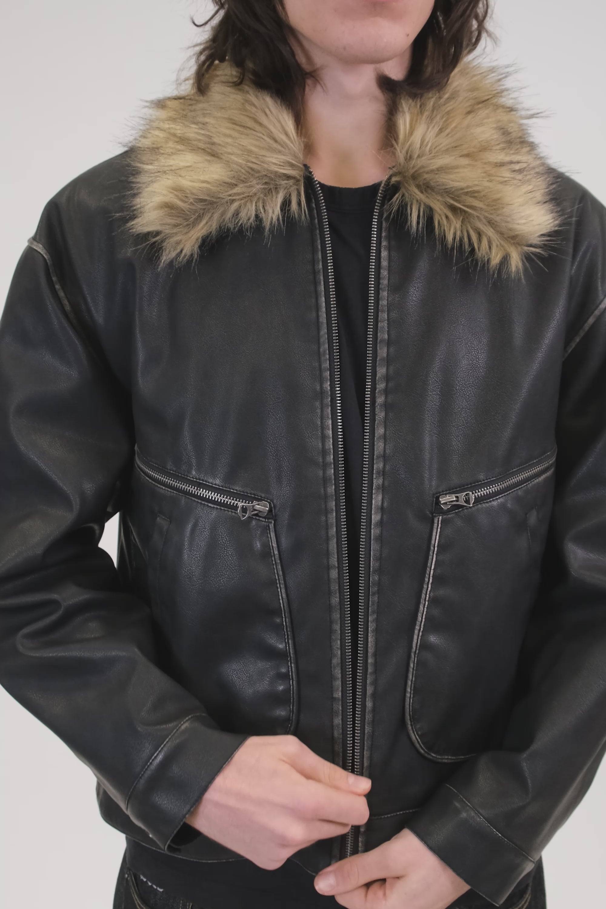 Notre Varsity Jacket Swarm est une veste varsity en faux cuir, avec une coupe droite. Le col en fourrure est détachable.