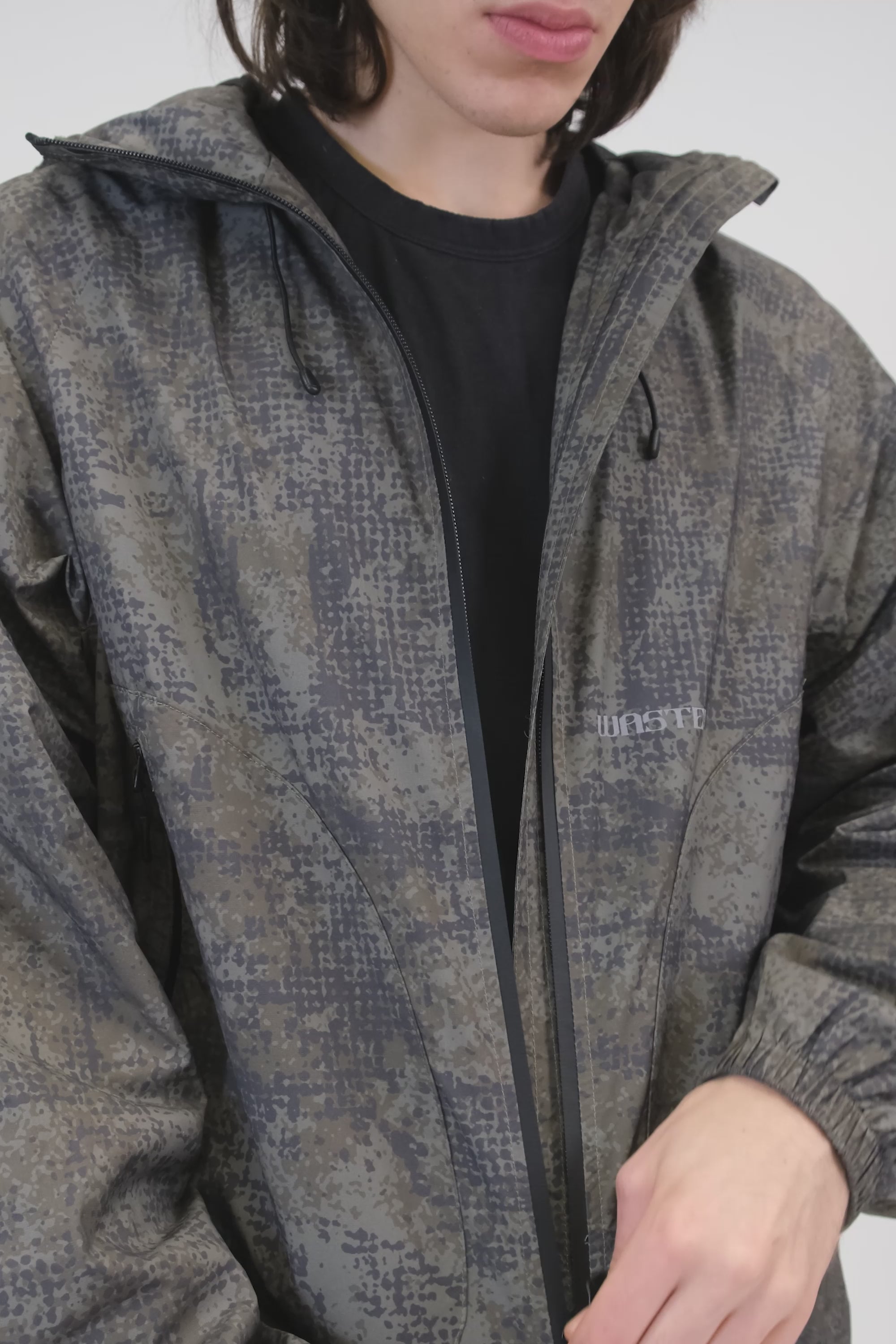 Notre Windbreaker Swarm est un coupe-vent en coton et polyester à coupe boxy, avec un imprimé camo all-over par sublimation et de nombreux détails techniques.